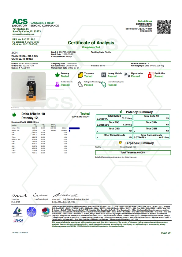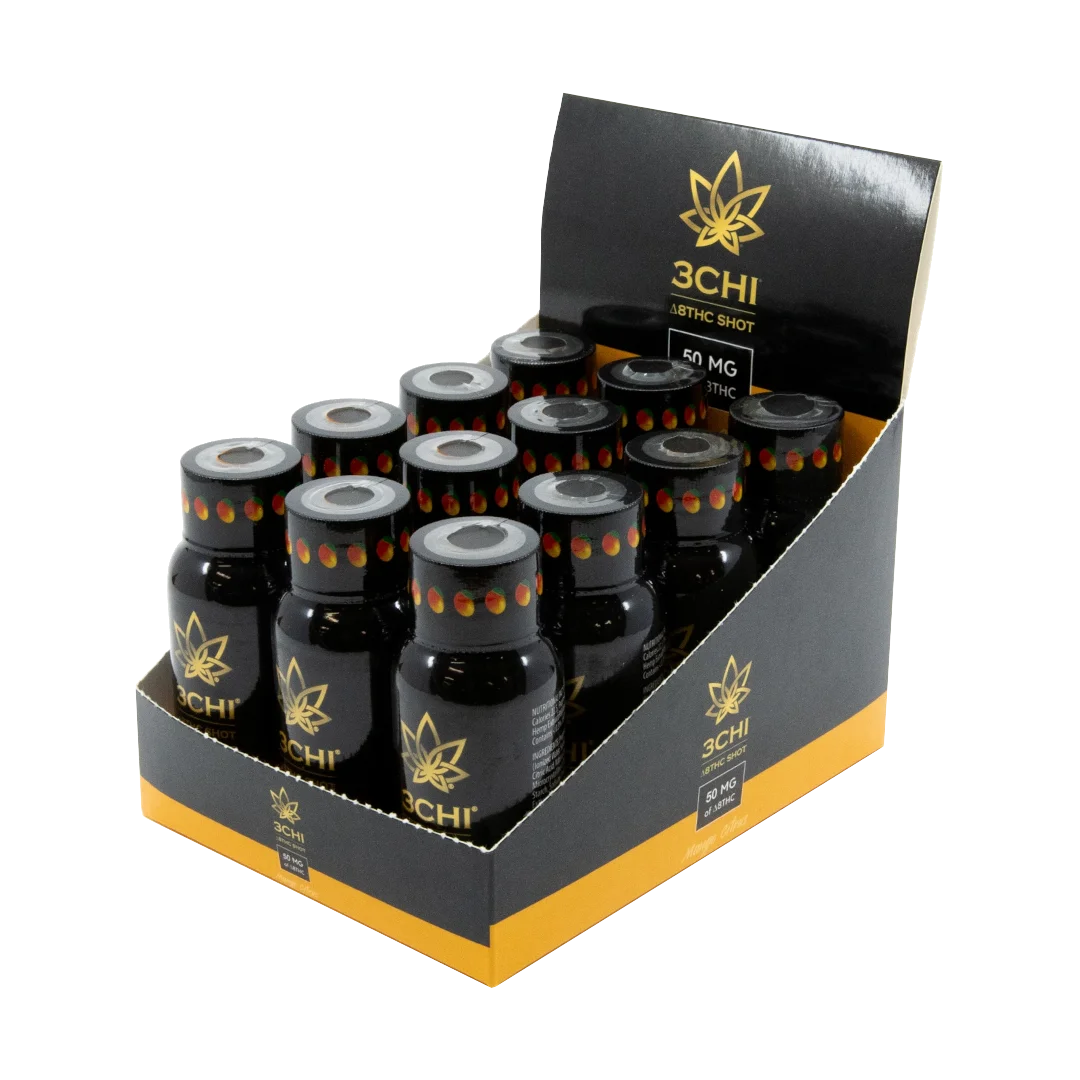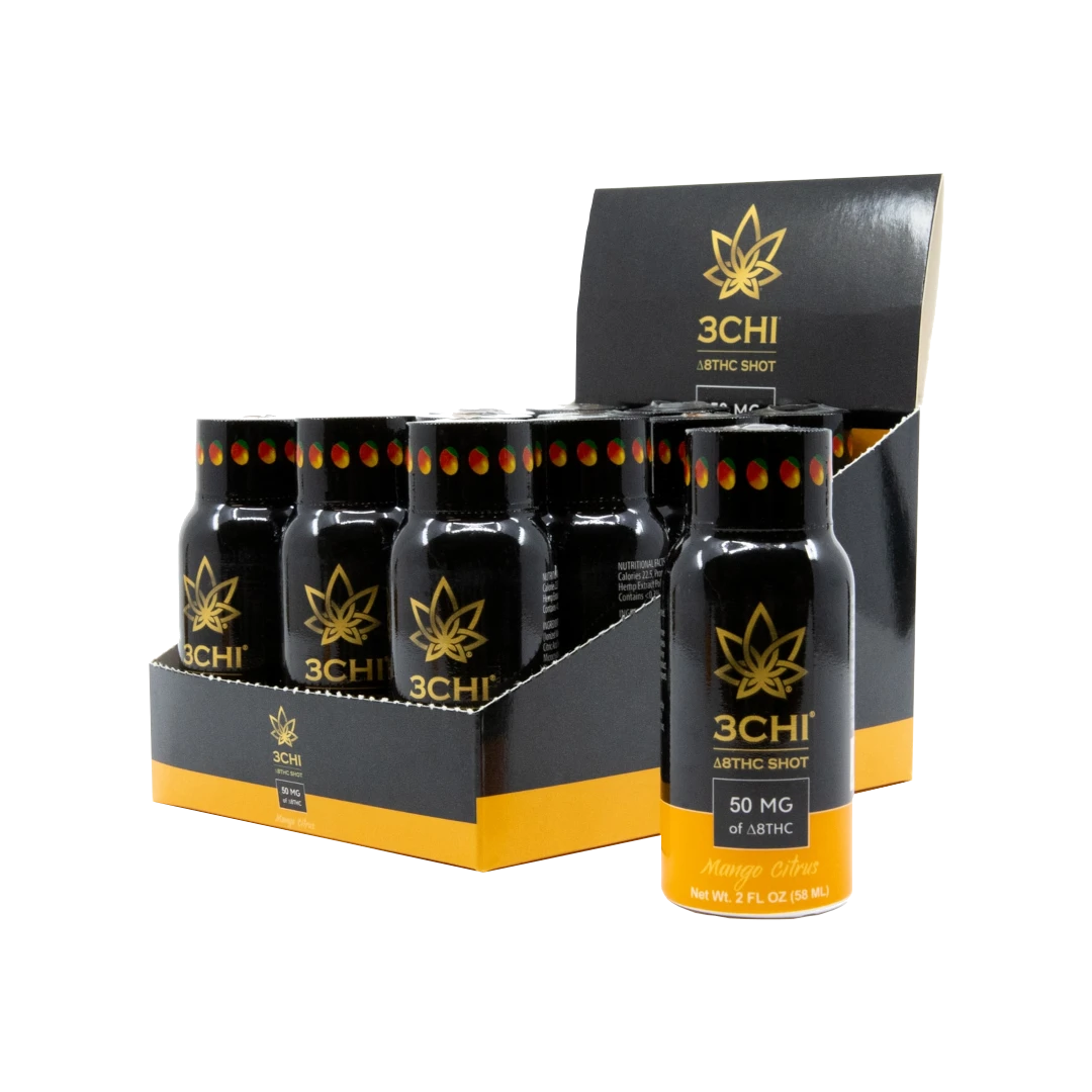 Experience full mind, body, and spirit relaxation with 3CHI Delta 8 Shots in tangy Mango Citrus flavor. Available for purchase online or at our Dallas, Texas location. Each shot contains 25mg of Delta 8 THC for fast-acting relief.