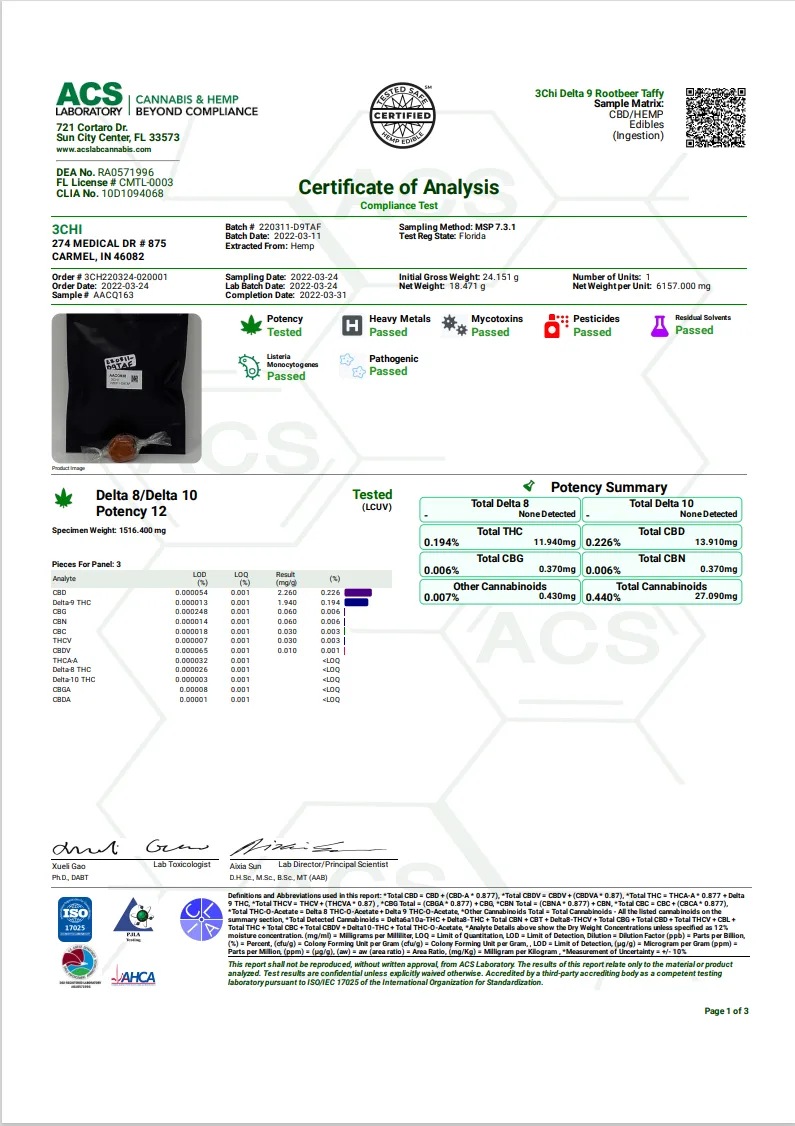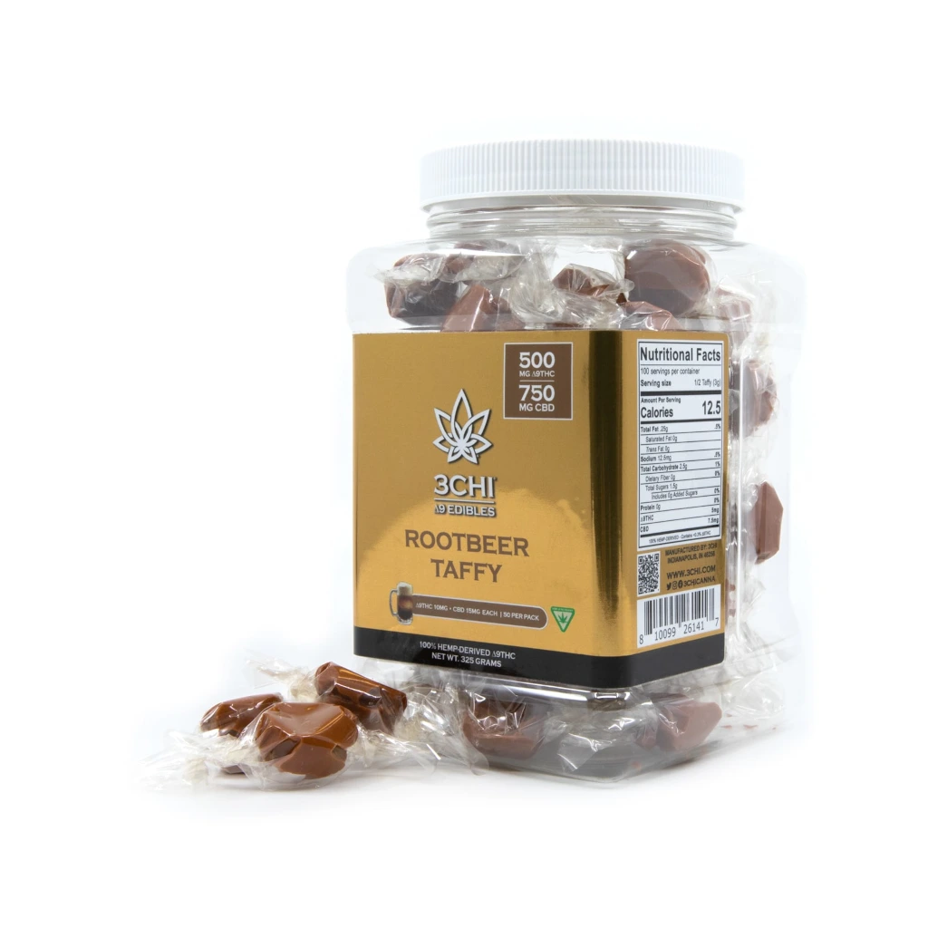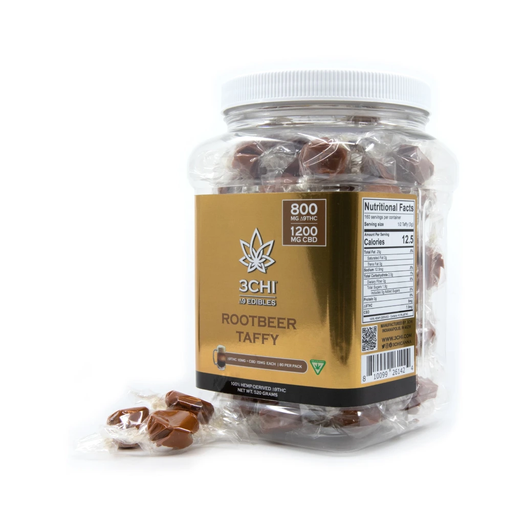 Discover the fast-acting 3CHI Delta 9 THC Root Beer Taffy Candy in Delta 8 Dallas. Each piece contains 10mg Delta 9 THC and 15mg CBD, offering a potent, delightful experience.