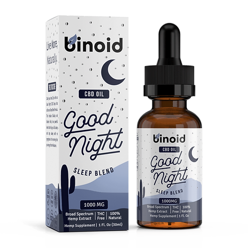 Binoid Good Night CBD Oil – Sleep Blend combines 1000mg of broad-spectrum CBD with valerian root, skullcap, and essential oils to promote restful sleep. Vegan, gluten-free, and THC-free. Available online or in our Dallas, Texas location!