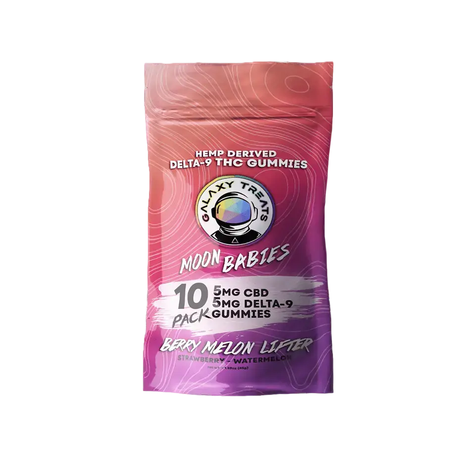 Experience the vibrant flavors of Tropical Kush and Berry Lemon Lifter with Galaxy Treats’ Moon Babies CBD:Delta 9 THC Gummies, available in Dallas, Texas. Lab-tested and made from 100% industrial hemp for a delightful, balanced experience.