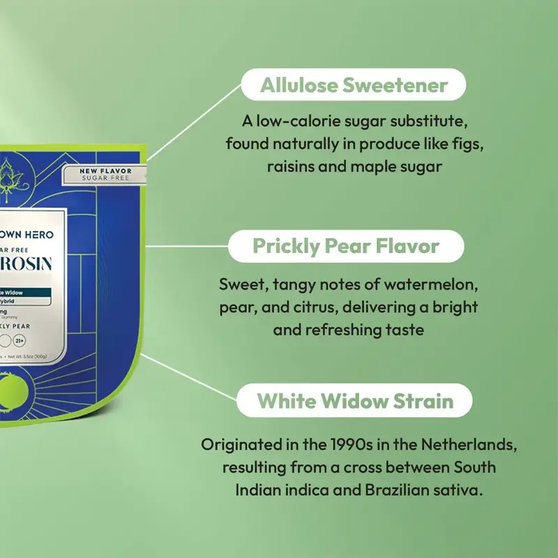 Indulge in the Live Rosin Delta 9 THC Gummies, offering a sugar-free, balanced hybrid experience with 25mg of Delta 9 THC per piece.