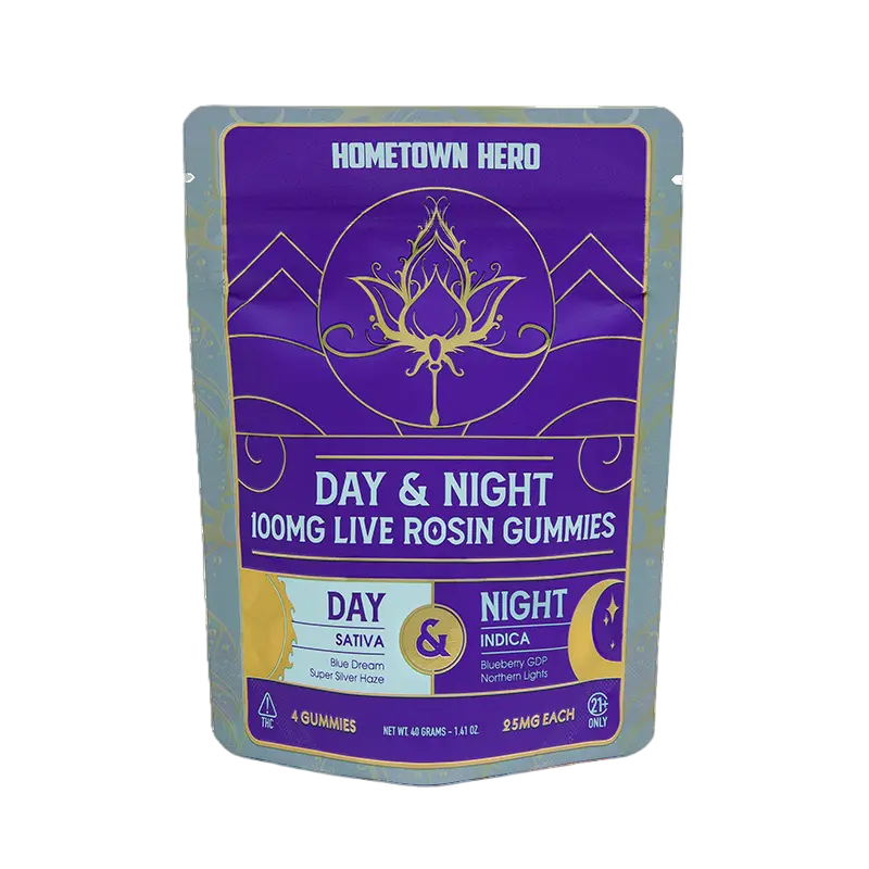 Indulge in the Live Rosin Gummies Day & Night from Hometown Hero in Dallas, Texas. This sampler includes four individually wrapped gummies infused with 25mg Delta 9 THC and 5mg live rosin concentrate, perfect for day and night enjoyment.