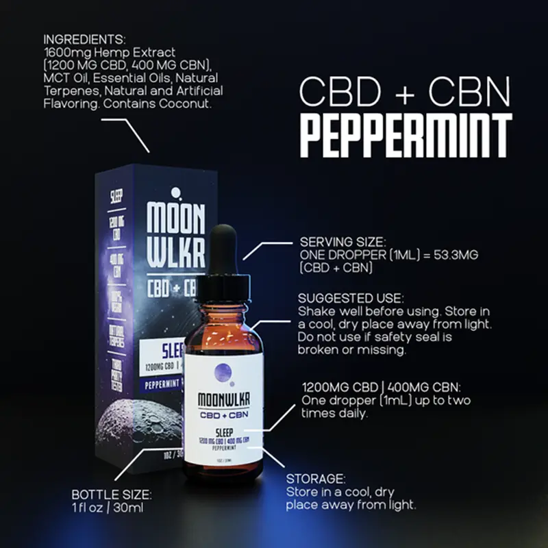 Discover the calming effects of MoonWlkr’s CBD + CBN Sleep Tincture, available online or in our Dallas, Texas location. This 3:1 blend with peppermint flavor promotes deep, restful sleep.